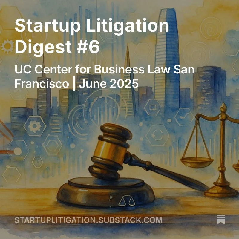 Check out the Startup Litigation Digest a project Evan leads at UC Law San Francisco. The latest edition features high-profile cases involving startup fraud, board failures, and regulatory actions—including CaaStle’s $500M accounting scandal, GameOn’s alleged $60M fraud, the indictment of AllHere’s founder, a $2.1M investor scam involving La Mancha, and Cookies’ $18M arbitration win in a cannabis joint venture.